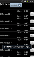 İmsakiye 2013 uygulaması Tüm Türkiye şehirlerimiz için sahur ve iftar vakitleri ile her bir günün detaylı imsak,öğle,ikindi, akşam ve yatsı ezan vakitleri bulunmaktadır.. Bunun yanında güneş in doğuş zamanı da gösterilmektedir.